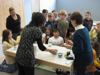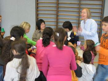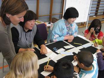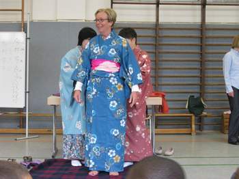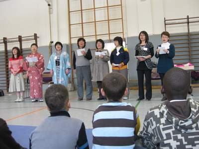 8 Frauen waren extra privat aus Japan angereist, um ihre Kultur unseren Schülern näher zu bringen. Frau Bonn eine Dipl. Übersetzerin in Deutsch-Japanisch hatte den Kontakt vor einigen Monaten zur Schule hergestellt. Die Frauen engagieren sich in Japan ehrenamtlich und betreuen Kinder in einem Kindertheater. In Deutschland wollen sie sich über Kinder- und Jugendarbeit informieren.