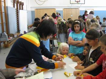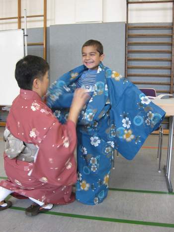 Liebevoll, lustig und durchdacht brachten 8 Frauen aus Japan den Grundschülern ihre Heimat näher. Eine echte japanische Teezeremonie erleben, einen Kimono anziehen, ihren Namen auf japanisch schreiben, Origami, singen und vieles mehr erlebten die Fehrsschüler heute hautnah.