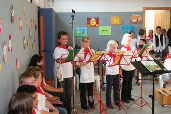 Musikalische AGs werden ja schon immer an der Schule groß geschrieben.So zeigten gleich im Anschluß die Flöten AG- und die Orff AG- Kinder ihr Können unter der Leitung von unserer Musiklehrerin Frau Bukatz, die dann gekonnt durch das weitere Programm führte