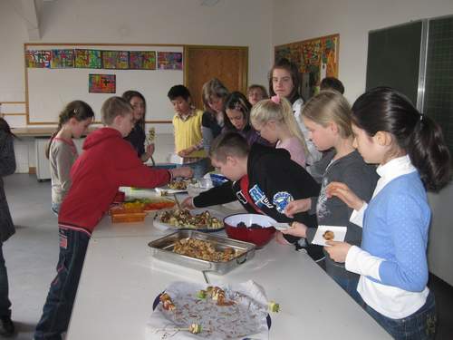 Dies stellten am Donnerstag die Fehrsschüler/innen während ihres gemeinsamen gesunden Frühstücks fest. In Zusammenarbeit mit Elternvertretern wurden mit Hilfe einer Ernährungsberaterin und der Küche  gesunde Rezepte zusammengestellt, die die Lehrer mit den Klassen am Morgen ausprobierten und die Eltern am Abend ausprobieren konnten.