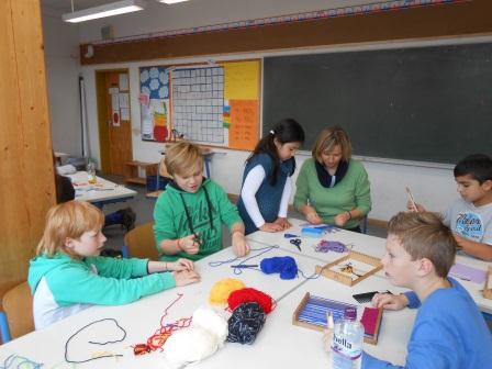 So entstanden wunderschöne kleine „Teppiche“, auf die alle Kinder stolz waren. Nebenbei wurden dann aber auch noch Freundschaftsbänder geknotet und Götteraugen in verschiedenen Größengebunden.