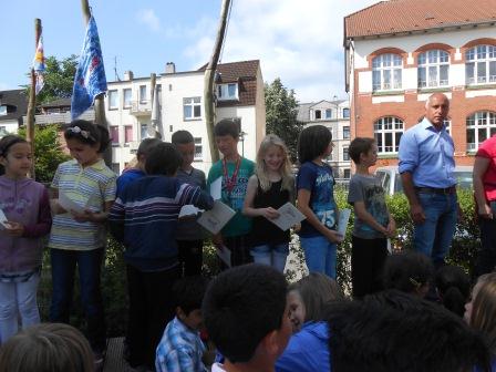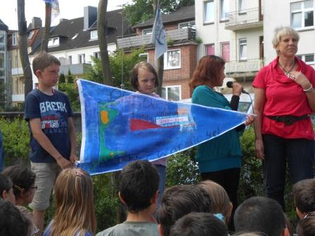 Am 11.6. hißten die 4. Klassen ihre Abschiedsflaggen. Es begann die Klasse4a von Frau Schümann