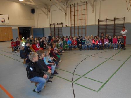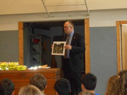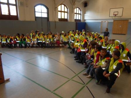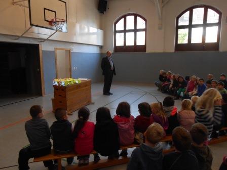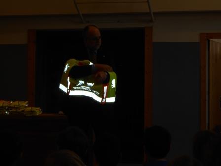 Gerhard Hillebrand, Stellvertretender Vorsitzender des ADAC Schleswig- Holstein, überreichte am 22.Oktober 85 Westen an Erstklässler der Fehrs Schule