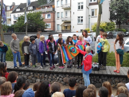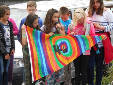 Die 4. Klassen hissten ihre Flaggen zum Abschied aus der Grundschule. Es war ein emotionaler Moment für alle Schüler und Lehrer.