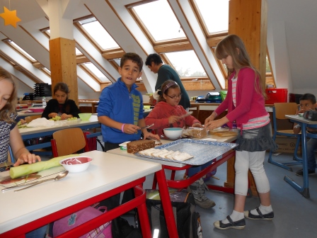 Auf den Fluren vor den Klassen wurdendie verschieden Köstlichkeiten aufgebaut. So gab es für jedes Kind eine große Auswahl an leckeren Speisen.