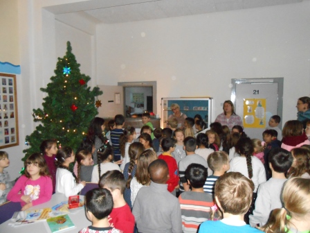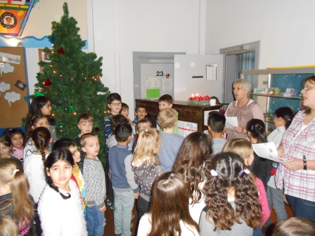 Jeden Montagmorgen im Advent treffen sich die Klassen zum gemeinsamen Singen. Frau Delfs begleitet die Weihnachtslieder am Klavier