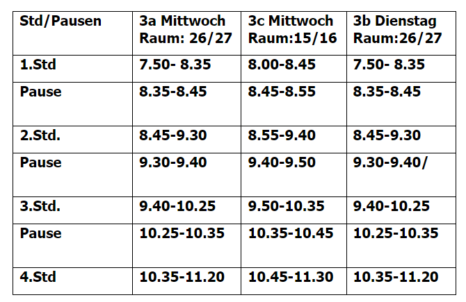 Die Klassen 3a und 3c werden mittwochs und die Klasse 3b wird dienstags Unterrichtsangebote bekommen.